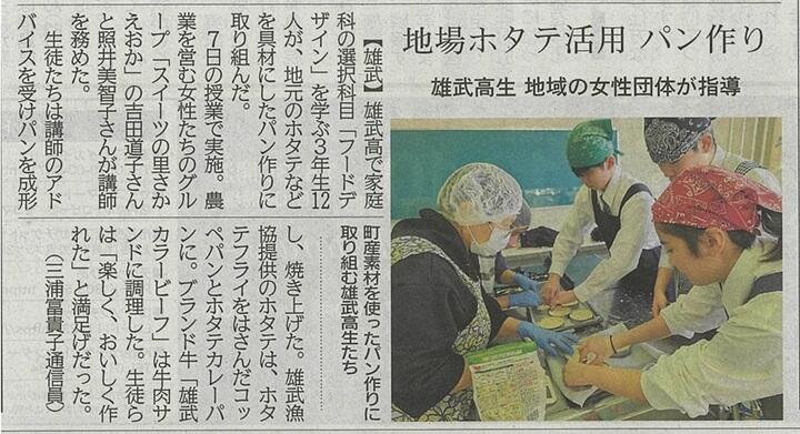| 『地場ホタテ活用 パン作り 雄武高生 地域の女性団体が指導』 11月13日掲載 |